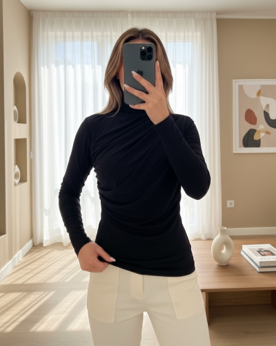 Yarım Boğaz Büzgülü Sandy Bluz Siyah