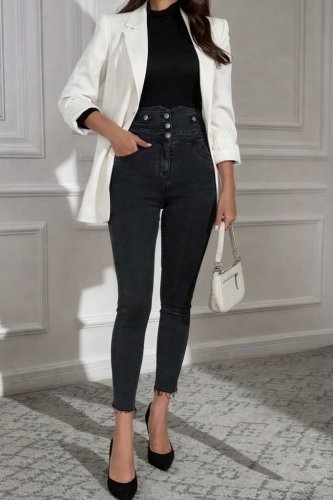 Kadın yüksek bel önden düğmeli cepli dar kesim detaylı kot pantolon