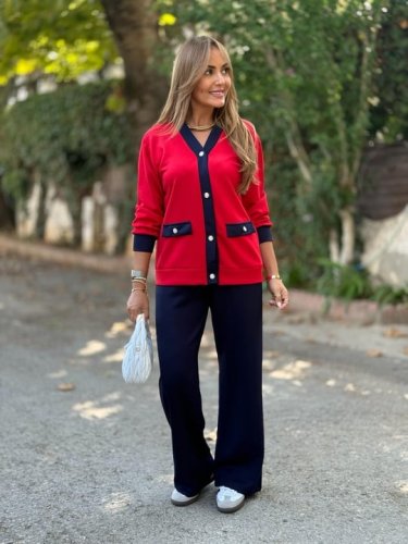 Kadın uzun kollu ribanali cep detay hırka ve bol paça pantolon ikili takım