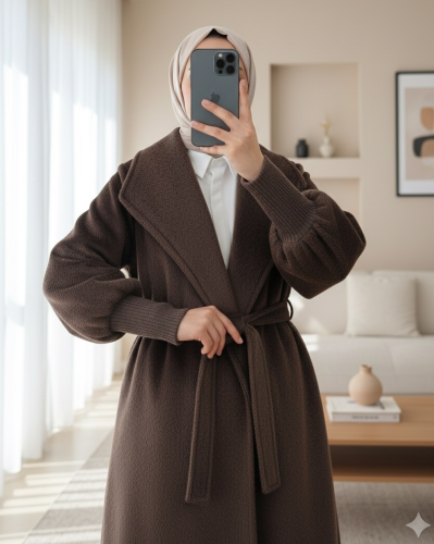 Kolu Ribanalı Şal Yaka Astarlı Kaşe Kaban K Kahve